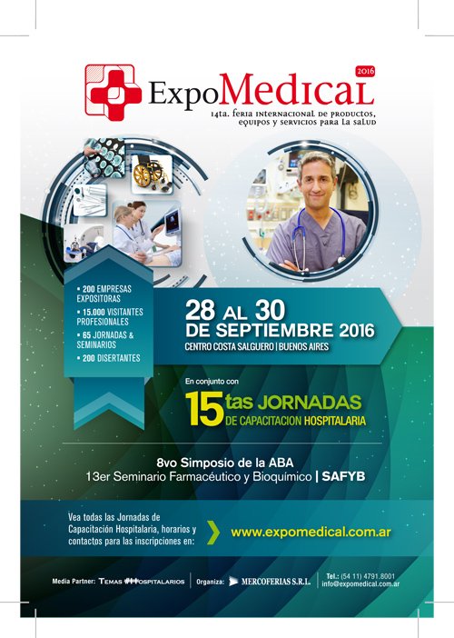 Con alrededor de 200 expositores, toda la tecnología al servicio de la Salud será expuesta, del 28 al 30 de septiembre de 2016 en los pabellones del Centro Costa Salguero, Buenos Aires, y con una convocatoria de más de 15.000 visitantes profesionales.