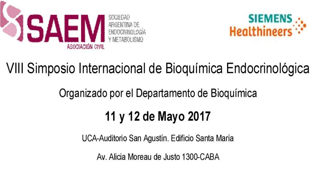 El 11 y 12 de mayo de 2017 se llevará a cabo el VIII Simposio Internacional de Bioquímica Endocrinológica, organizado por el Departamento de Bioquímica de la Sociedad Argentina de Endocrinología y Metabolismo (SAEM). El lugar del encuentro es en la UCA -Auditorio San Agustín- Edificio Santa María, Alicia Moreau de Justo 1300, Ciudad Autónoma de Buenos Aires, un ámbito académico localizado en un área de fácil acceso para los asistentes.