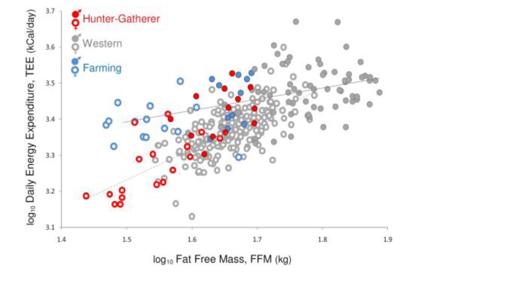 En un estudio realizado en paralelo en el llamado Modelo de Transición Epidemiológica sobre más de 300 participantes se constató que personas totalmente inactivas consumían en promedio apenas 200 Kcalorías/día menos que personas con alta actividad física. Por otra parte un adulto Hdaza consume caminando un kilómetro la misma cantidad de calorías que un europeo o americano en la misma actividad. También es dable observar en todos los grupos sociales que el consumo calórico llega a un plateau y más alla de él, la producción de ácido láctico y otros ajustes metabólicos lo limitan.