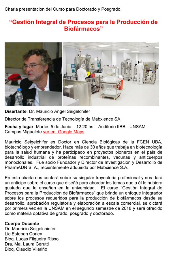 Como dicen los responsables de este curso puede calificarse como super novedoso en una universidad ya que directivos de la industria biofarmacéutica dictan una materia completa (16 semanas) donde se incluye y discute la problemática del día a día de la industria. No es habitual que los alumnos de posgrado, doctorado o grado puedan acceder a esta información de primera mano.
