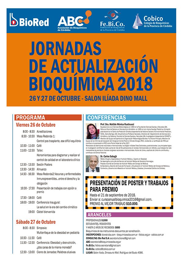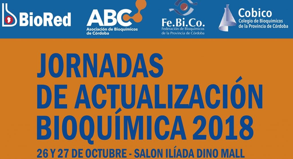 Los días 26 y 27 de octubre, se realizará en el Centro de Eventos del Dinosaurio Mall, de la Ciudad de Córdoba las Jornadas de Actualización Bioquímica 2018, este evento es organizado en forma conjunta por el Colegio Bioquímico de Córdoba, Federación de Bioquímicos de la provincia de Córdoba, Asociación de Bioquímicos de Córdoba y Bio Red S.A.