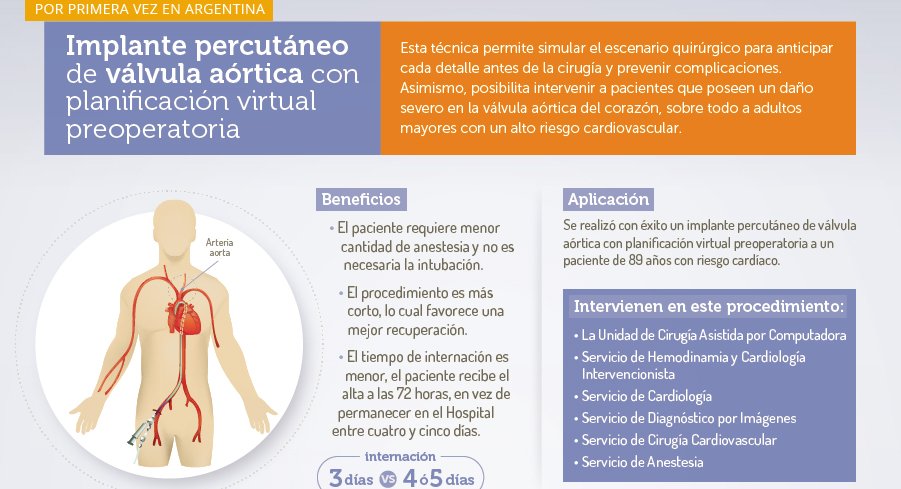 Un implante percutáneo de válvula aórtica con planificación virtual se realizó en el Instituto de Medicina Cardiovascular del Hospital Italiano de Buenos Aires. Es el primero de este tipo en Argentina. De esta forma, lograron anticipar el escenario quirúrgico, decidir con precisión aspectos fundamentales de la cirugía y predecir y prevenir posibles complicaciones.