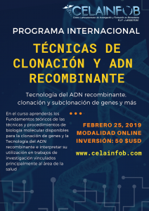 CELAINFOB anuncia un importante curso online para el 25 de febrero de 2019: “Técnicas de clonación y ADN recombinante”. En este curso se enseñarán los fundamentos teóricos de las técnicas y procedimientos de la biología molecular disponibles para la clonación de genes y la tecnología del ADN recombinante e interpretar su utlización en trabajos de investigación vinculados principalmente al área de la salud.