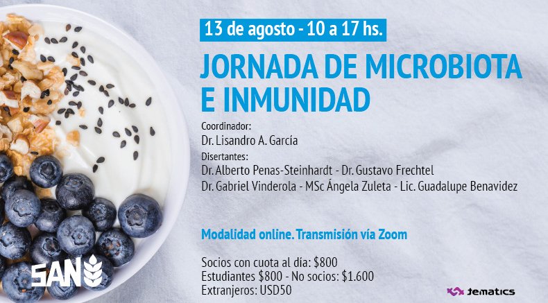 Invitamos a participar de la “Jornada: Microbiota e inmunidad”, a desarrollarse a través de la plataforma Zoom, el día jueves 13 de agosto en el horario de 10 a 17hs.