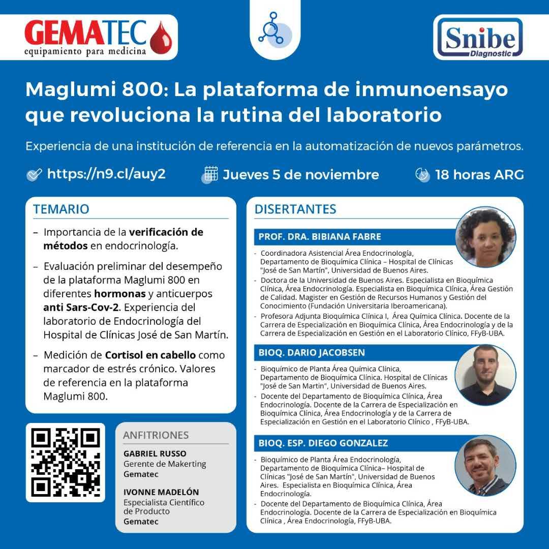 La plataforma de inmunoensayo que revoluciona la rutina del laboratorio. Webinar gratis !!! Gabriel Russo e Ivonne Madelón, de Gematec, serán los anfitriones de destacados profesionales que contarán su experiencia en instituciones de referencia en la automatización de nuevos parámetros.