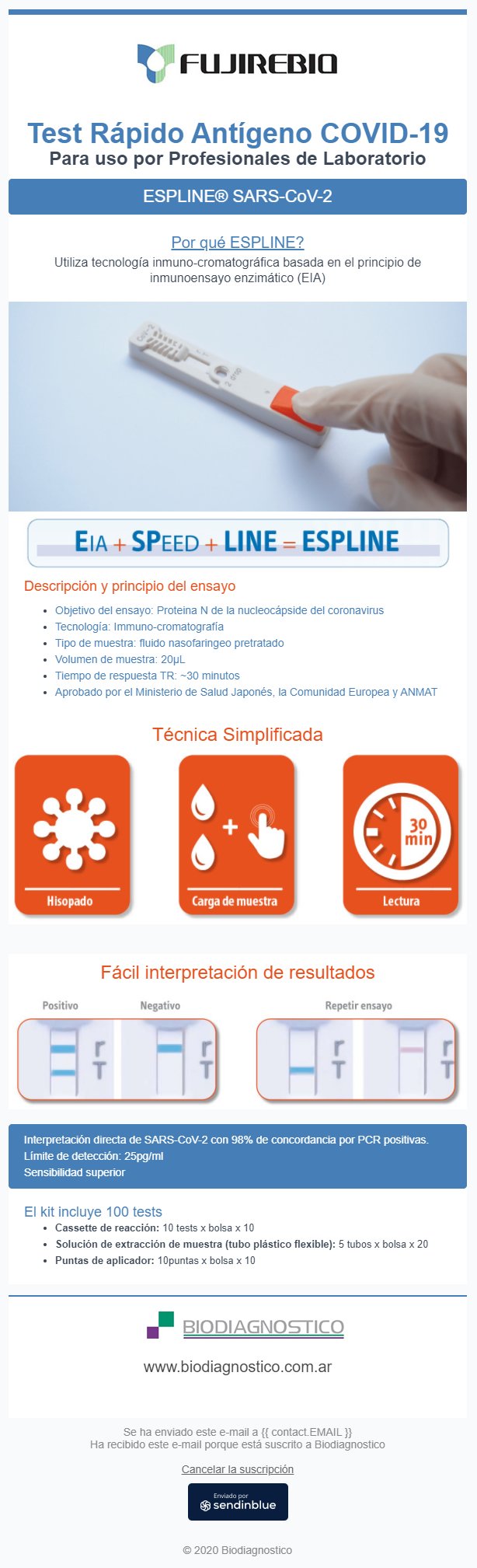 La firma Biodiagnóstico informa que tiene en stock ESPLINE°SARS-Cov-2 que utiliza tecnología inmuno-cromatográfica en el principio de inmunoensayo enzimático (EIA).