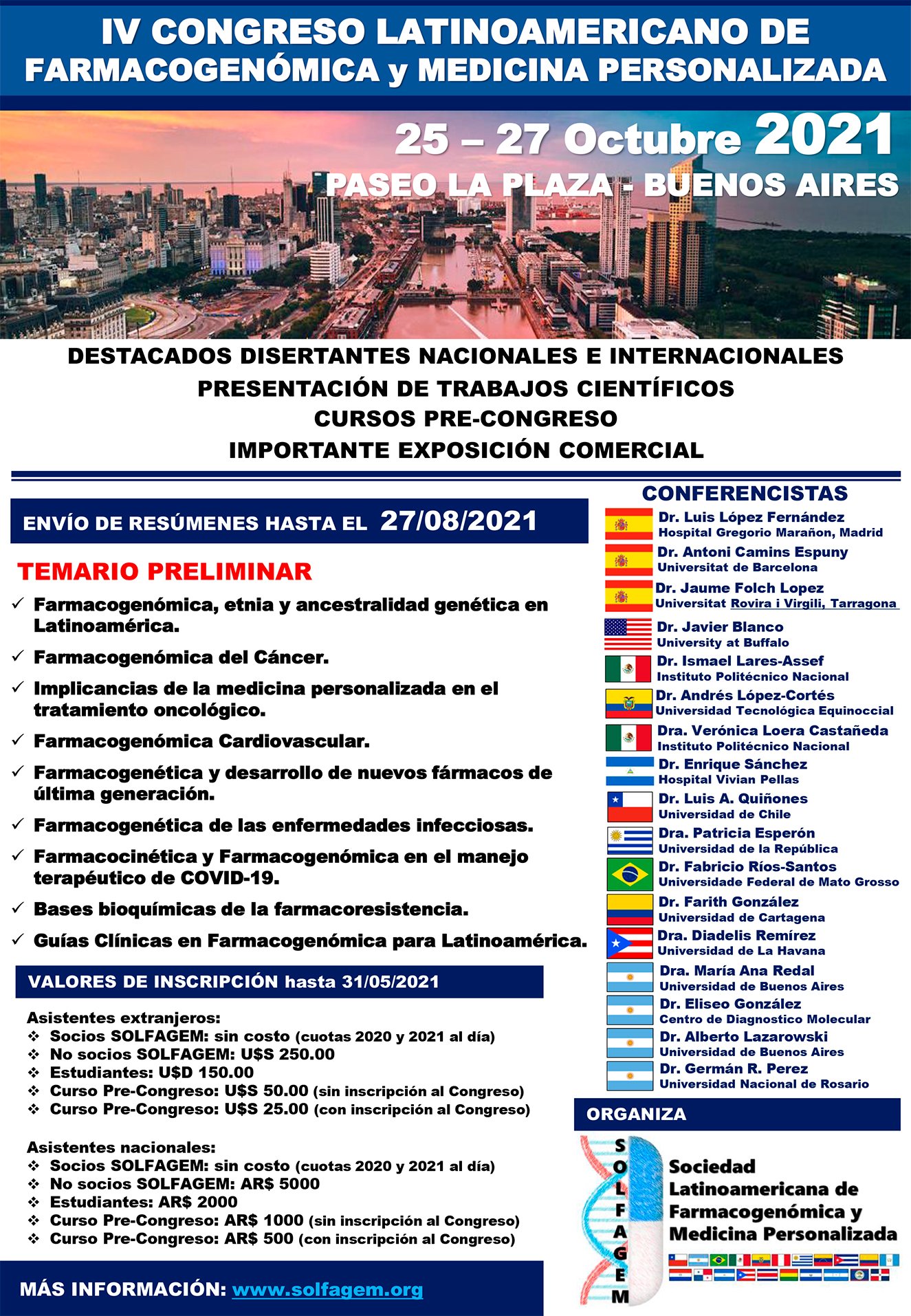 Con la presidencia de la Dra. María Ana Redal, la Sociedad Latinoamericana de Farmacogenómica y Medicina Personalizada (SOLFAGEM) organiza el IV CONGRESO LATINOAMERICANO DE FARMACOGENOMICA y MEDICINA PERSONALIZADA. Será del 24 al 25 de octubre, en el Paseo La Plaza, en el centro de la ciudad de Buenos Aires.Ya se confirmó la presencia de importantes y destacados profesionales.
