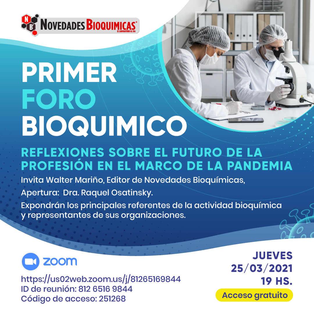 REFLEXIONES SOBRE EL FUTURO DE LA PROFESIÓN EN EL MARCO DE LA PANDEMIA. Invita Walter Mariño, Editor de Novedades Bioquímicas, a este foro a realizarse el jueves 25 de marzo de 2021 a las 19 hs. La apertura estará a cargo de la Dra. Raquel Osatinsky.