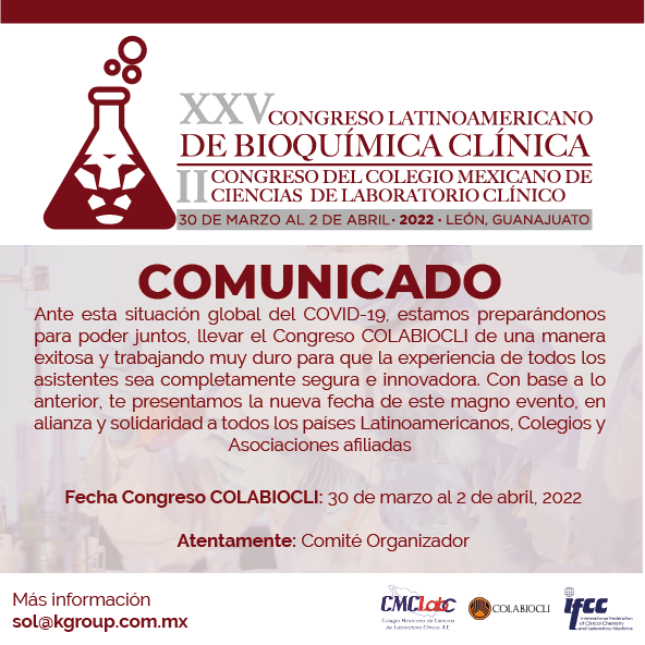 COMUNICADO XXV CONGRESO LATINOAMERICANO DE BIOQUÍMICA CLÍNICA – II CONGRESO DEL COLEGIO MEXICANO DE CIENCIAS DE LABORATORIO CLÍNICO.