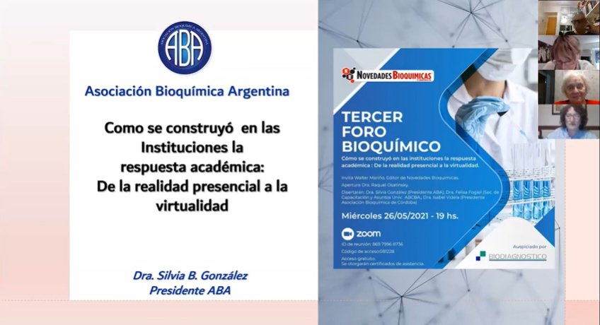 Exposición de la Dra. Silvia González, Presidente ABA, en el Tercer Foro Bioquímico: “Cómo se construyó en las instituciones la respuesta académica, de la presencialidad a la virtualidad”.