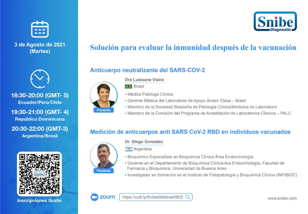 “Anticuerpos neutralizantes del SARS-CoV-2” a cargo de la Dra. Luissane Vieria (BRA) y “Medición de anticuerpos anti SARS CoV-2 RBD en individuos vacunados” a cargo del Dr. Diego González (ARG).