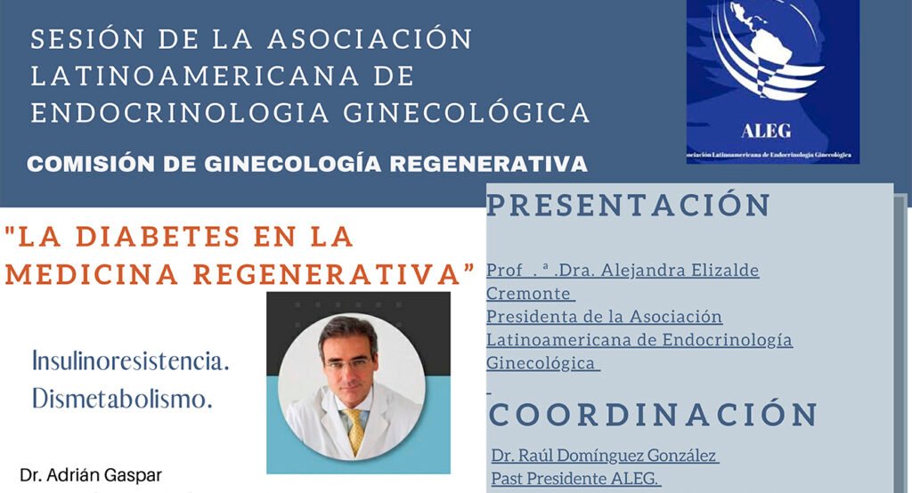 El viernes 13 de agosto 2021 la Comisión de Ginecología Regenerativa de ALEG efectuará una sesión virtual acerca de “La diabetes en la Medicina Regenerativa”, con la participación de los doctores Adrián Gaspar (Insulinoresistencia; Dismetabolismo) y Guillermo Rossi (Herramientas para estimar la insulino resistencia). Hará la presentación la Dra. Alejandra Elizalde y coordinará el Dr. Raúl González Domíngez. Habrá una ventana para preguntas.