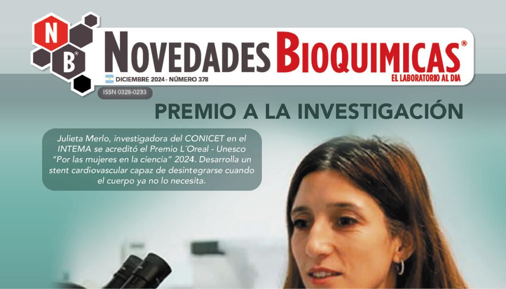 DICIEMBRE 2024 * Para estar al día: Nuestra web !!! www.novedadesbioquimicas.com * Recibí nuestro Newsletter. Versión online (Suscribite): wmediciones@gmail.com* Seguinos en las Redes * PREMIO A LA INVESTIGACIÓN: Julieta Merlo, investigadora del CONICET en el INTEMA se acreditó el Premio L´Oreal – Unesco “Por las mujeres en la ciencia” 2024. Desarrolla un stent cardiovascular capaz de desintegrarse cuando el cuerpo ya no lo necesita.