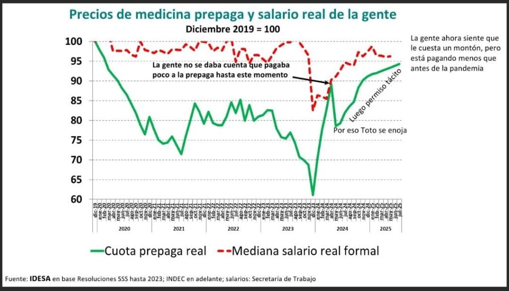 Un dato central expuesto por Colina es que, tomando diciembre de 2019 como base 100, las cuotas de la medicina prepaga en 2025 alcanzaron el punto más alto desde el inicio de la pandemia, pero todavía se ubican por debajo del nivel real previo a 2020. Es decir, en términos reales, las cuotas no lograron recomponer completamente el terreno perdido desde la pandemia. Sin embargo, la percepción social es que la medicina privada resulta más costosa, aún cuando se paga menos en términos relativos que antes de la pandemia. Esto es consecuencia del deterioro del salario real de la población.